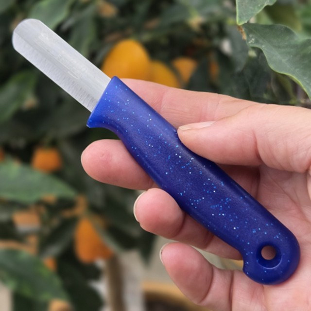 Bandstaal mes met 65mm lemmet en een ronde punt. Dit lichtgewicht mes heeft een rood kunststof heft en is universeel toepasbaar. Uitermate geschikt voor het oogsten van bijv. paprika, komkommer en tomaten. Zeker ook voor het verwerken van boeketten van de bloemist.